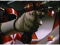 Shockatron talks, spreads arms and slowly reaches his right hand forth, causing the connector cable in his wrist to extend outward. |