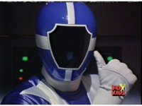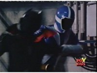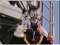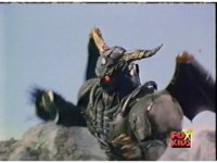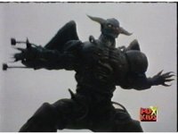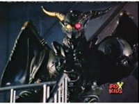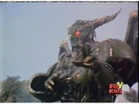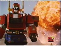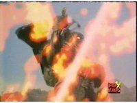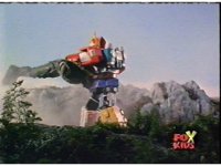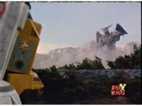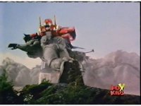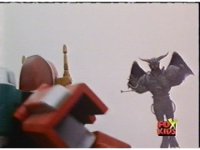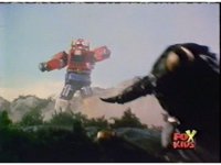 Both Lightspeed Megazord & Shockatron pace left, then the monster leaps forth and swoops into the Megazord, which holds him back from impacting, before grabbing him and tossing him away, where he falls and rolls back up. |