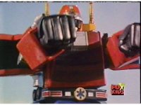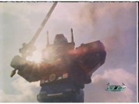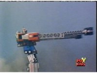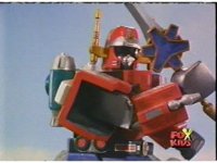 Semi-track around as Lightspeed Megazord raises its Saber and poses in the sunlight. |