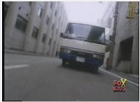 POV shot of Shuttle driving on the sidewalk, with Asian people frozen in terror, including a pair of flashers. |