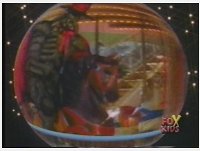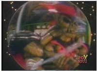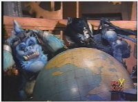Rita looks out from Repulsascope in anger, camera zooms out and she kicks large globe of Earth into Baboo & Squatt, knocking them down. |