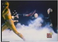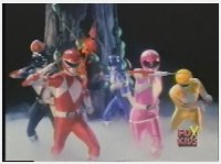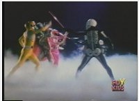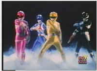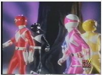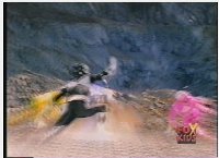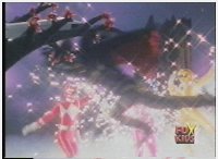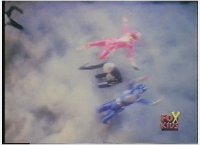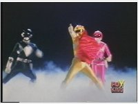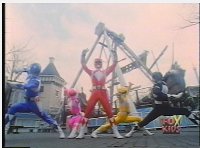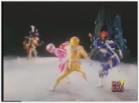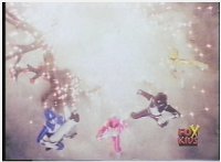 Pink, Black and Yellow Rangers are flipped through the air. |