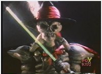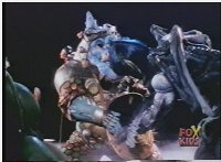 Rita approaches Finster, happily gesturing and talking to him as he finally picks up Bones mold and takes it off, Baboo & Squatt continuing their fight in the back. |