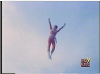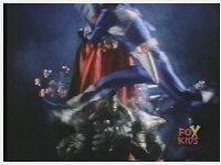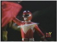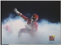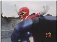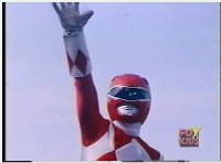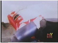 Red Ranger falls through the air, arms stretched out, kinda Superman style. |