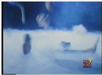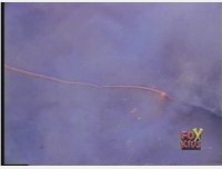 Pan up from the smoking body of the T-Rex, which rages and swing around. |