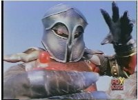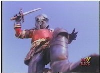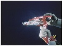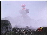Red Ranger, with Blaster, finally shakes loose of the distracted Giant's grip. |