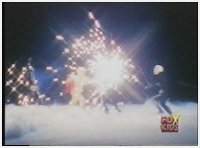 Four Rangers are looking upward as bomb behind them explodes sparkily. |