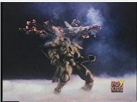 Giant gets smashed sparkily in the smoking-chest by T-Rex's tail again, knocking him away. |