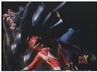 Red Ranger continues leaping up, passing beneath Tyrannosaurus' jaw. |