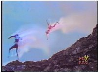 Blue & Pink Rangers flail about as they fall over the side of a cliff. |