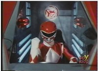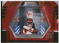 Red Ranger drops into his cockpit seat, gestures arm then looks down to our right |