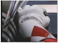 Close up of Red Ranger in cockpit, looking down to the side at his teammates on the ground before resuming focused operation. |