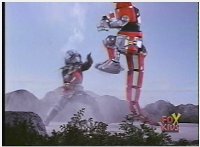 Red Ranger lands on top of Tyrannosaurus' head then drops inside. |