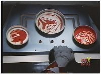 Console display of Red helmet and Red Zord face shoot energy to the TRex symbol at the top which glows brightly. |