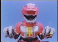 Red Ranger exits cockpit and stands atop Tyrannosaurus Dinozord's head, pumping fist into the sky as the Zord opens and closes jaw . |