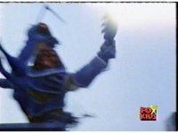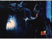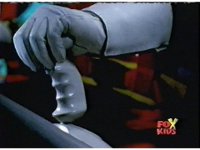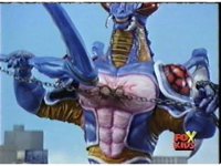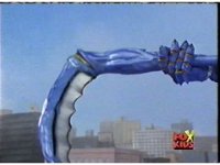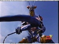Mantevil is struck by the energy slashes, spark bursts brightly. Unharmed, he slashes an energy bolt from his scythe over to Omega Megazord, spark bursting it, before fireballs erupt around it. |
