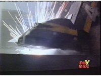 Supertrain Megazord's feet make sparkily contact with the rails. |