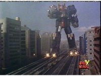 Lightspeed Solarzord lowers on thruster boots into the city. |