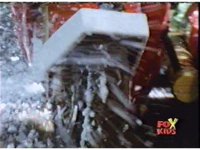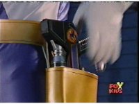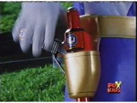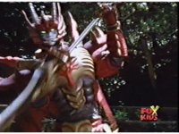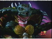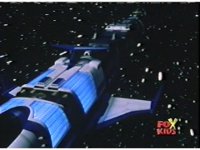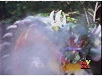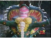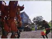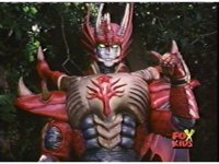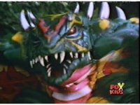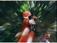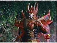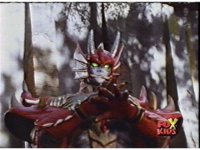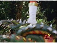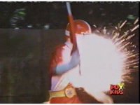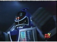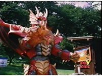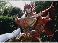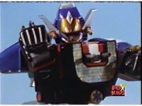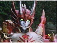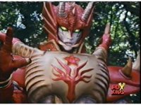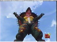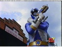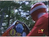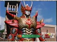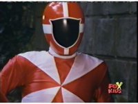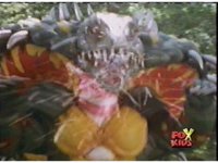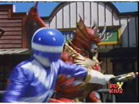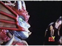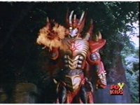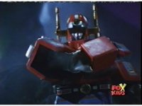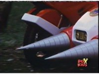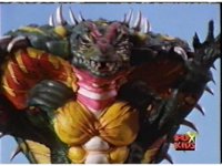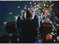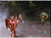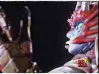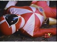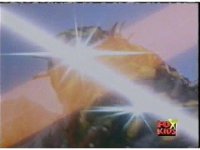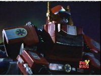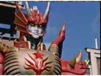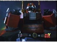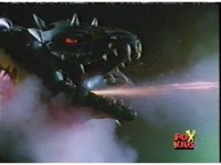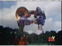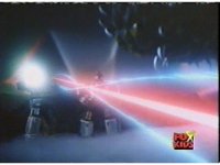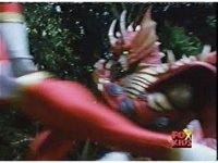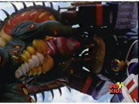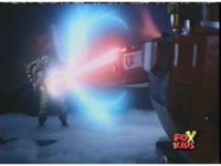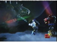 Red works the controls in his cockpit, Lightspeed Megazord firing more wrist lasers at Freezard, but misses as he slips away. LM looks around, and sees Freezard's giant head appear in the dimension, spewing blasts that burst both LM & Max Solarzord. |
