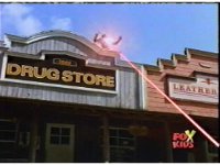Pan down Blue's back as he faces Olympius and Batlings in a Western Town. Olympius remains still, as Blue lowers his fists, and slowly approaches, before stopping and making a fist. Olympius finally gestures forth, Batlings charge ahead, prompting Blue to unholster his Thermo & Rescue Blasters and charge at them. |