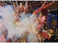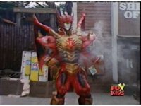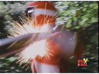 Olympius fire blasts Red, bursting him until he falls down, where he fires his Rescue Blaster sparkily back at the Demon, before leaping forth with it. |