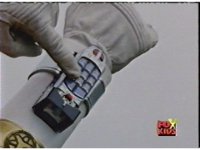 A Ranger slides open the Thermo Blaster, inserts the Battle Booster, and presses some buttons on it. |