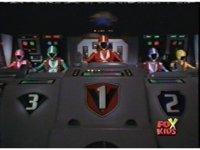 In the Omega cockpit, the Rangers make gestures of victory. |