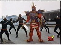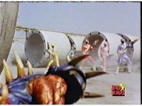 Infinitor stands around with some Batlings, until they get spark bursted down around him, the source of which is the five Rangers atop a nearby structure with Rescue Blasters. |