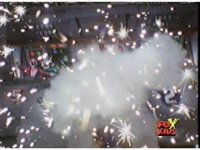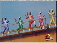 All five Rangers raise their V-Lancers in Blaster Mode to the sky and fire energy beams into one concentrated point, a Spectra Blast, which flashes with a V. They then lower the Spectra Blast, which flies away from them, flashing a V. |