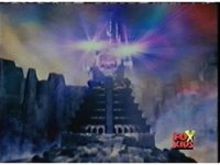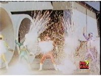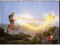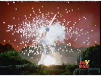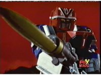 Omega Megazord fires its Missile Tip from its Spear down a hyperspace tunnel. |
