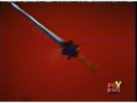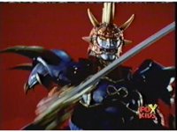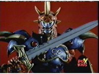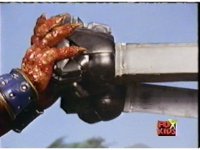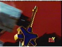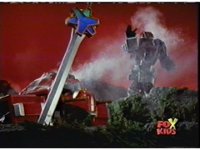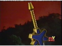Sharp zoom in on Lightspeed Megazord Saber, sticking in the ground across the way. |