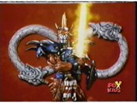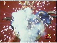 Infinitor gets ready, grabs Max Solarzord's leg, and spins it around in the air, before finally releasing, where it falls down. |