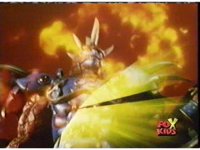 Infinitor sparkily slashes Lightspeed Megazord twice, knocking it back. |