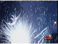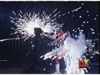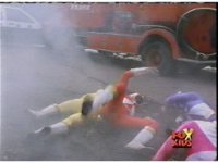 The two Red Rangers are thrown into the air as electricity crackles, and a fireball rises before them. |