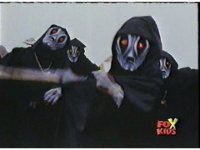 The blue & yellow energy slashes cuts through the Ghouls, shattering them, leaving only robes behind, as the eight Rangers regroup. |
