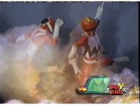 Zoom in on Triskull gloating, so Red readies Battle Booster, then flips over at him, but both of his punching fists are caught by the monster's hands. |