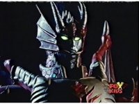 The two Red Rangers finally reach Triskull, who talks and fires his sword at them, spark bursting both down, before he talks at them some more. |