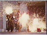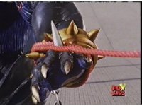 Both Reds wrap ropes around Triskull's arms, then cross them, only to have Triskull fire his energy breath on them, spark bursting them down. |