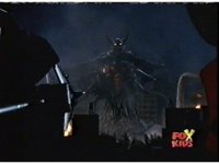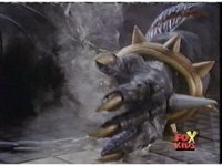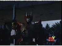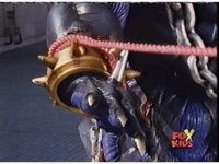 Omega Megazord falls down, cockpit shakes, Trakeena's tentacle hand reaches out, gets blocked by the Torozord spear (shh!), then gets sparkily cut off by the Orion Armored Galaxy Megazord's Saber. Trakeena then agonizes over her smoking stump. |