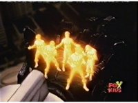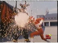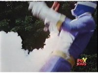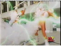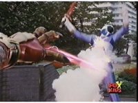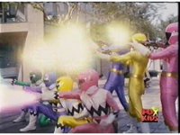 The two Ranger teams, each sans Red, regroups together facing the Demons, and fire, under Blue Lightspeed's command, their Thermo Blaster Booster Modes, or in the Galaxys' cases, their palms, firing colored energy into a rainbow blast that spark bursts the Demons. |