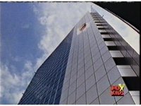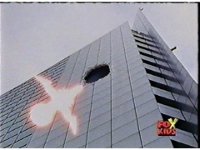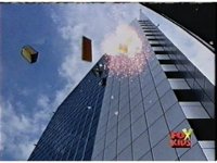 As a severed office building erupts into a series of explosions upon an overpass, the burned-out shell of an automobile is visibly flung about in the debris. |