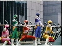 All five Galaxy Rangers morph at the same time using the Gingaman morphs. |