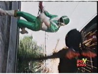 Racing alongside the side of the building on a rope, Green Lightspeed sparkily slashes Batlings. |