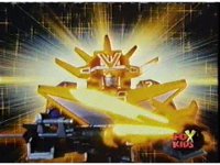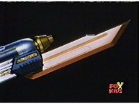 Galaxy Megazord's Orion Armored Saber begins to glow as it holds it forth. |