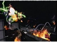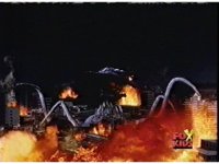 Caught in one of Trakeena's tentacles, Omega Megazord spark bursts, the cockpit shakes, and we see both OM & MS are being tossed about the burning city by the tentacles, before Trakeena energy spews at them, spark bursting them and they fall down. |