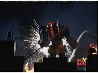 Omega Megazord is tentacle dropped to the ground, spark bursting the cockpit. |