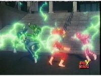 Olympius turns, sees Green Galaxy & Blue Lightspeed racing at him. Green leaps up and slashes, but his blade is caught in his hand, the Demon then kicking his feet out from under him. |
