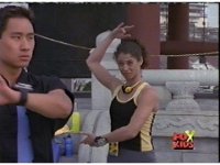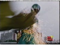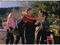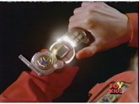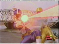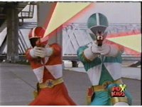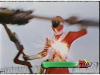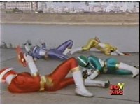 Red recovers, pulls out his Rescue Blaster, his teammates pulling out Thermo Blasters, and all fire on Memorase, who blocks each laser beam with his blades, until they cease firing. |