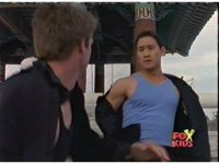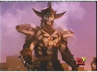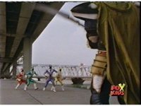 Memorase lowers his staff and talks, then notices the four Rangers on the scene. |