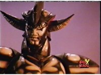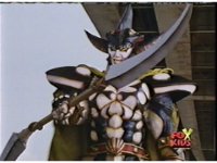 Memorase's eyes flash, zoom out as he twirls his double-bladed staff, then fires energy forth from the blades. |